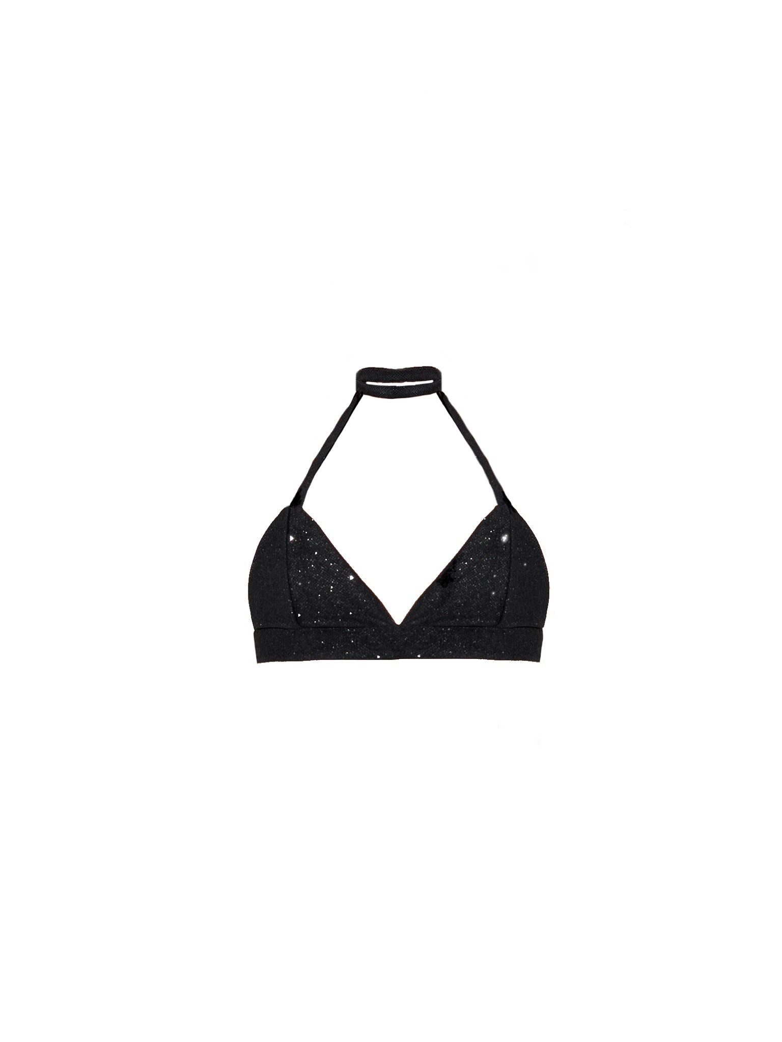 Bralette realizzata interamente a mano, all’interno in satin, mentre all’esterno in tulle bi-elastico Swarovski. La chiusura è in metallo sul retro e non è regolabile.