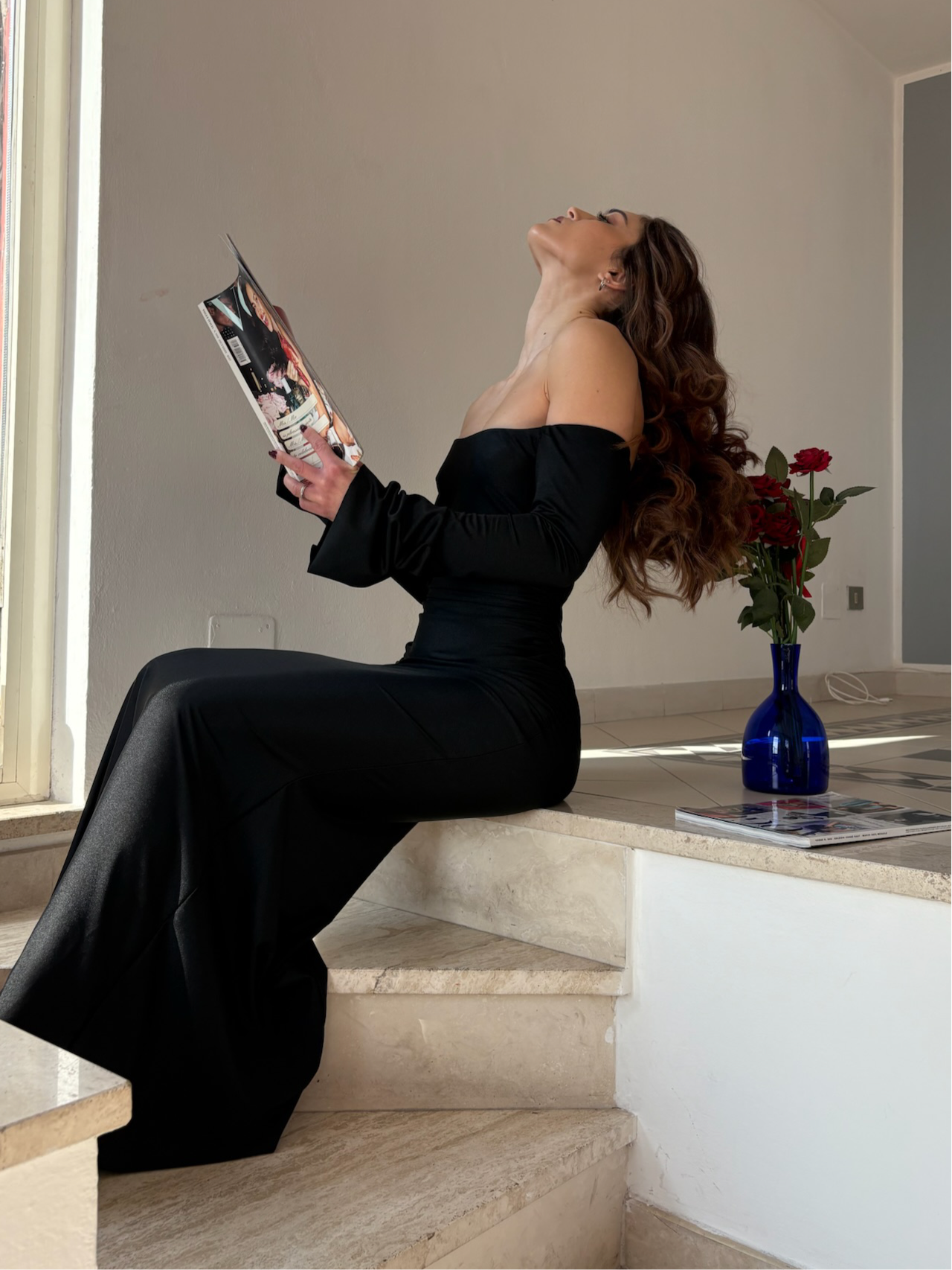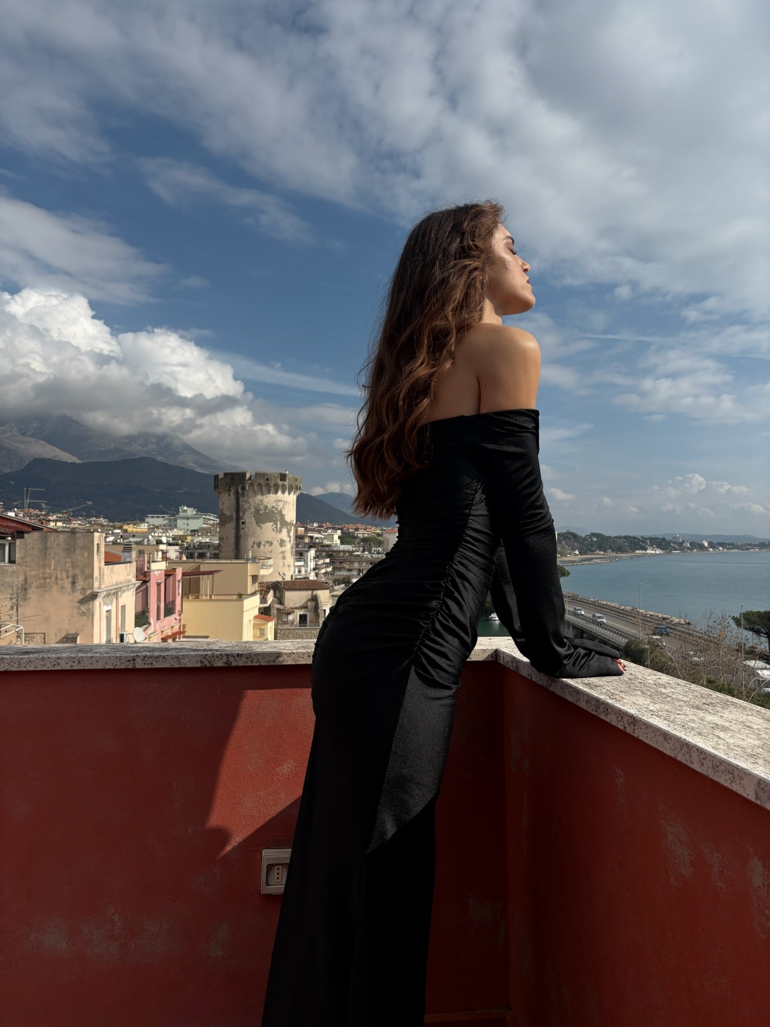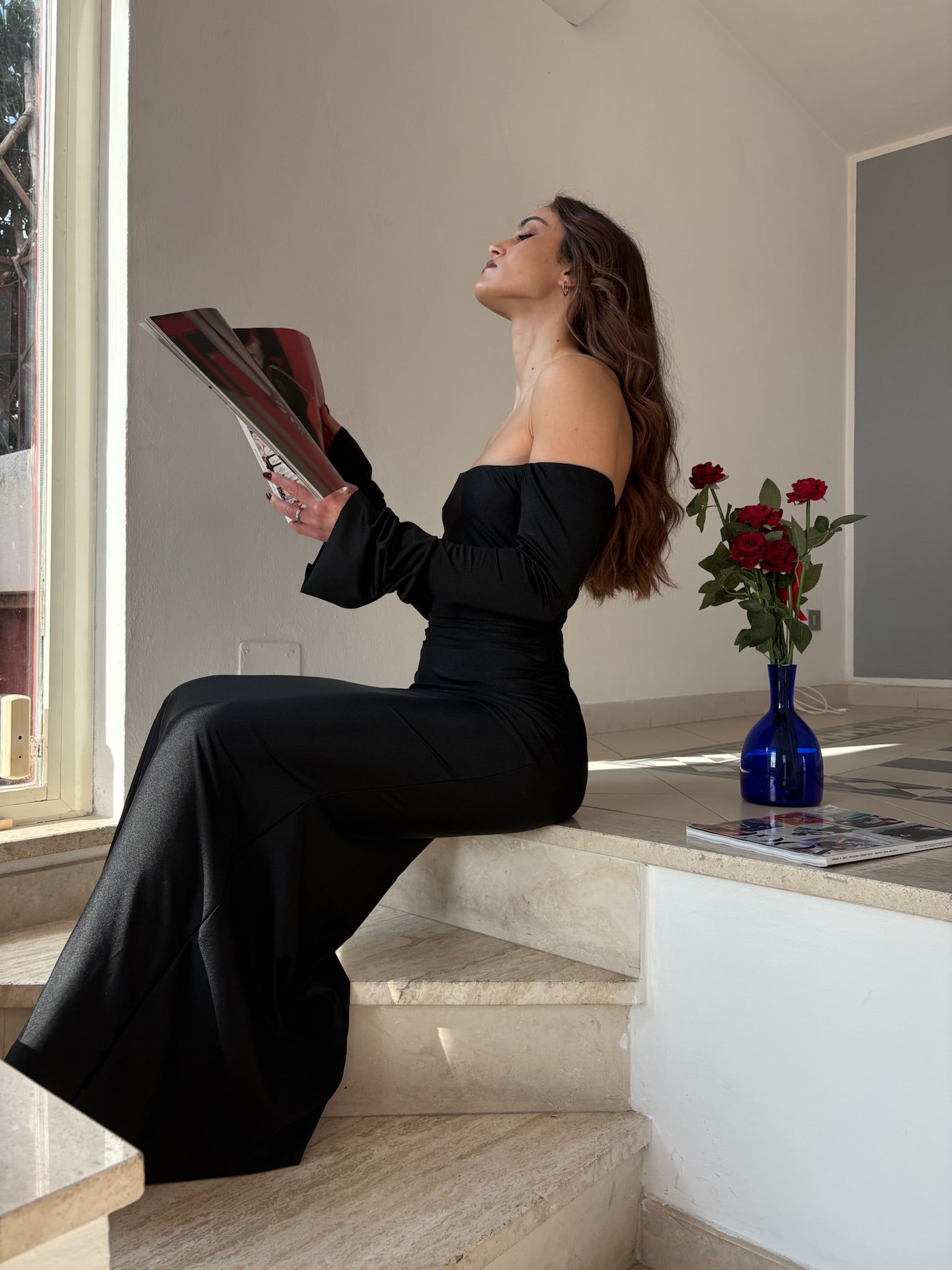 Le spalle scoperte e la manica svasata sul fondo donano al vestito un tocco raffinato in perfetto stile
